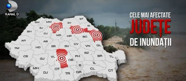 Viituri uriase, provocate de raurile involburate de la atatea ploi, au lovit crunt localitati care si-acum sunt sub ape! Prinsi intre puhoaie, oamenii au fost scosi pe brate din casele inundate insa pentru un copil si o batrana, salvatorii n-au putut face nimic. Baietelul in varsta de 4 ani a fost luat de viitura, iar trupul sau este, in continuare, de negasit, iar femeia a pierit inecata in apele revarsate. La mai bine de 10 ore dupa aceste tragedii, pericolul inundatiilor tine - in continuare - sub teroare jumatate de tara.