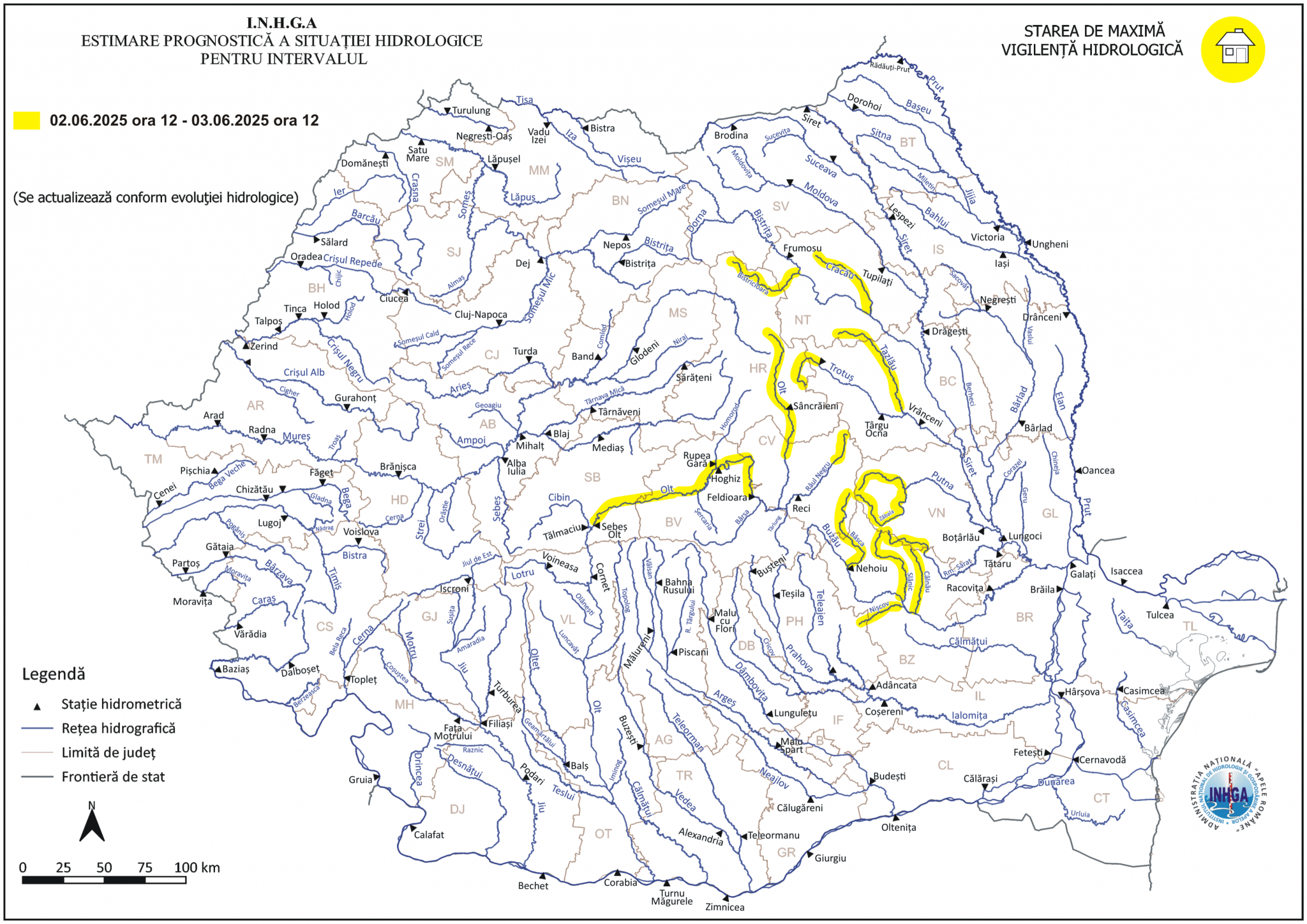 Institutul Național de Hidrologie și Gospodărire a Apelor (INHGA) a emis luni o avertizare hidrologică Cod galben de inundații, valabilă în intervalul 2 iunie, ora 12:00 – 3 iunie, ora 12:00, pentru râuri din nouă județe situate în regiunile Moldova și Muntenia.