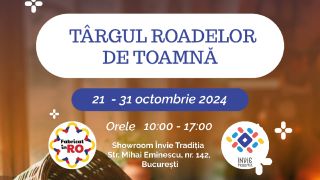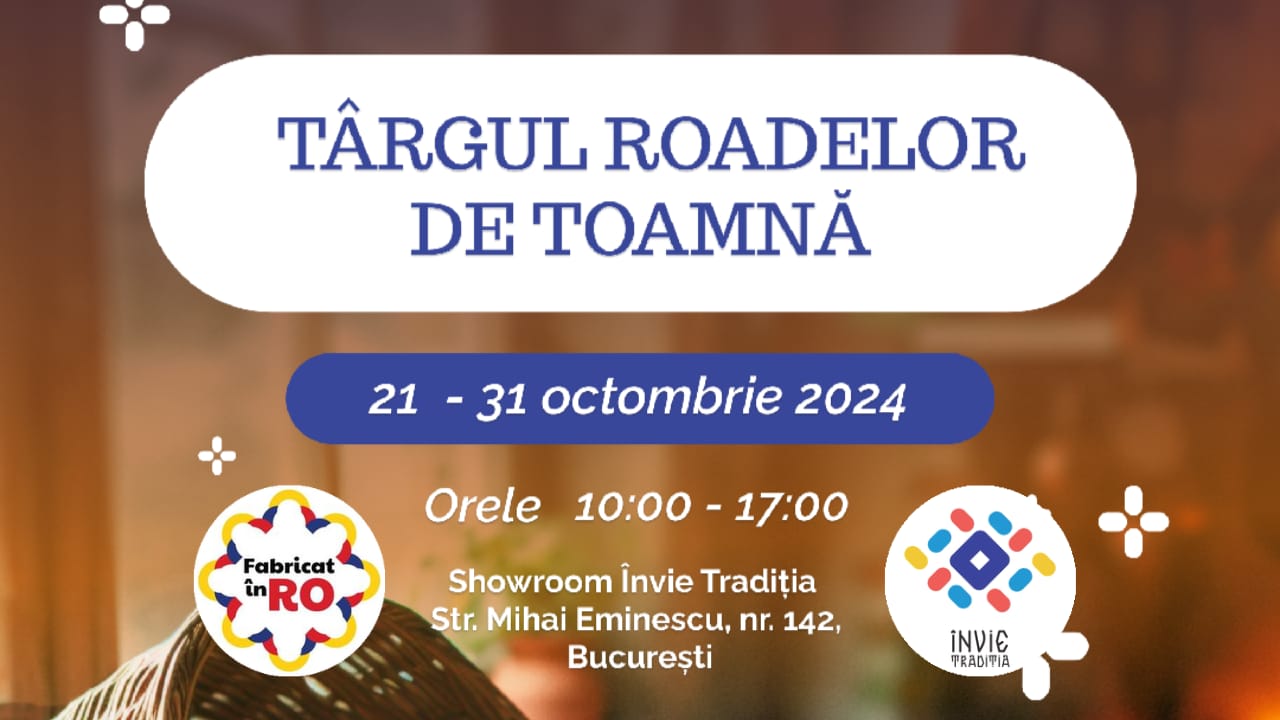 De astăzi, 21 octombrie 2024, Învie Tradiția- proiectul național care promovează meșteșugurile românești și menține vii tradițiile strămoșești- te invită să te delectezi cu produse artizanale romanesti la Târgul roadelor de toamnă!