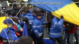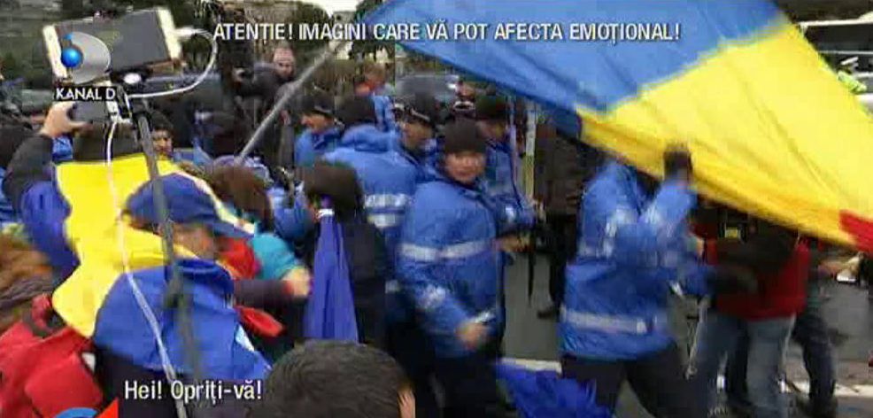 "Televiziunea, uitati cum Jandarmeria ne impinge si ne... Bai! Nu, nu! Nu asa, mai! Nu asa! Hotii, hotii! Fara violenta, fara violenta!