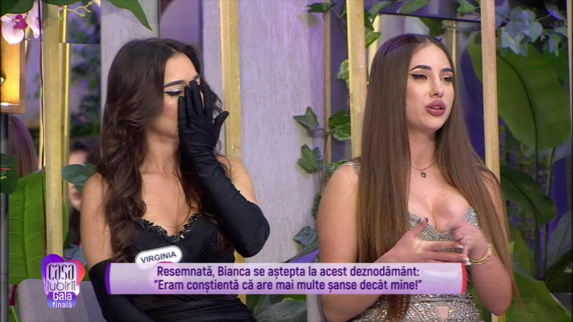 „Eu eram conștientă de faptul că Virginia are mai multe șanse decât mine. Mă bucur pentru ea real, pentru că e de la început aici și probabil a trecut prin mai multe decât am trecut eu.(...) Cred că seara asta e și despre premiu, și despre bani, dar și despre iubire. Eu oricum sunt câștigată, pentru că îl am pe Patrick”, a spus Bianca.