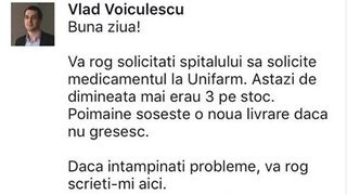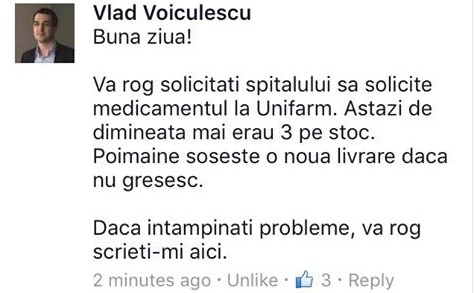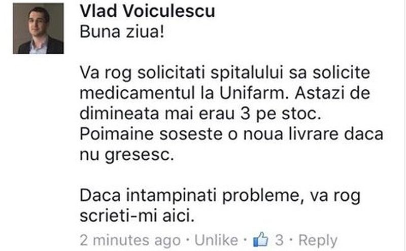 "Buna ziua, va rog sa solicitati spitalului sa solicite medicamentul la Unifarm. Astazi de dimineata mai erau 3 pe stoc. Poimaine soseste o noua livrare daca nu gresesc. Daca intampinati probleme, va rog scrieti-mi aici", a raspuns Vlad Voiculescu.