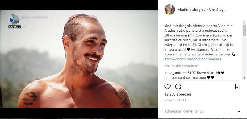 "Victorie pentru Vladimir! A adus patru puncte si a mancat sushi. Ultima lui masa in Romania a fost o masa surpriza cu sushi, iar la intoarcere il voi astepta tot cu sushi. Si am si dansat toti trei in seara asta! ❤ Multumesc, Vladimir. Eu, Zora si mama ta suntem mandre de tine", a scris Alice pe contul de Instagram.