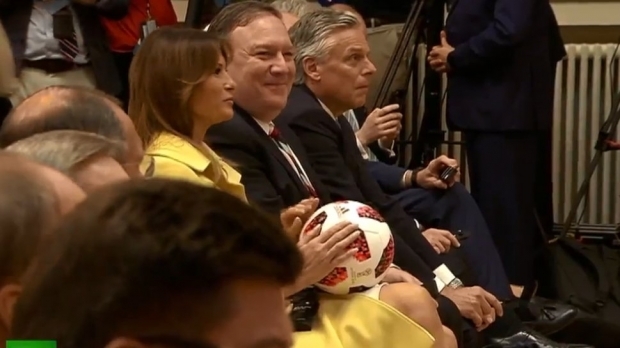 Donald Trump a multumit pentru minge si a apreciat ca ii va placea fiului sau cel mic. Liderul SUA a aruncat mingea spre sotia sa, Melania Trump, prezenta la conferinta de presa de la Helsinki.