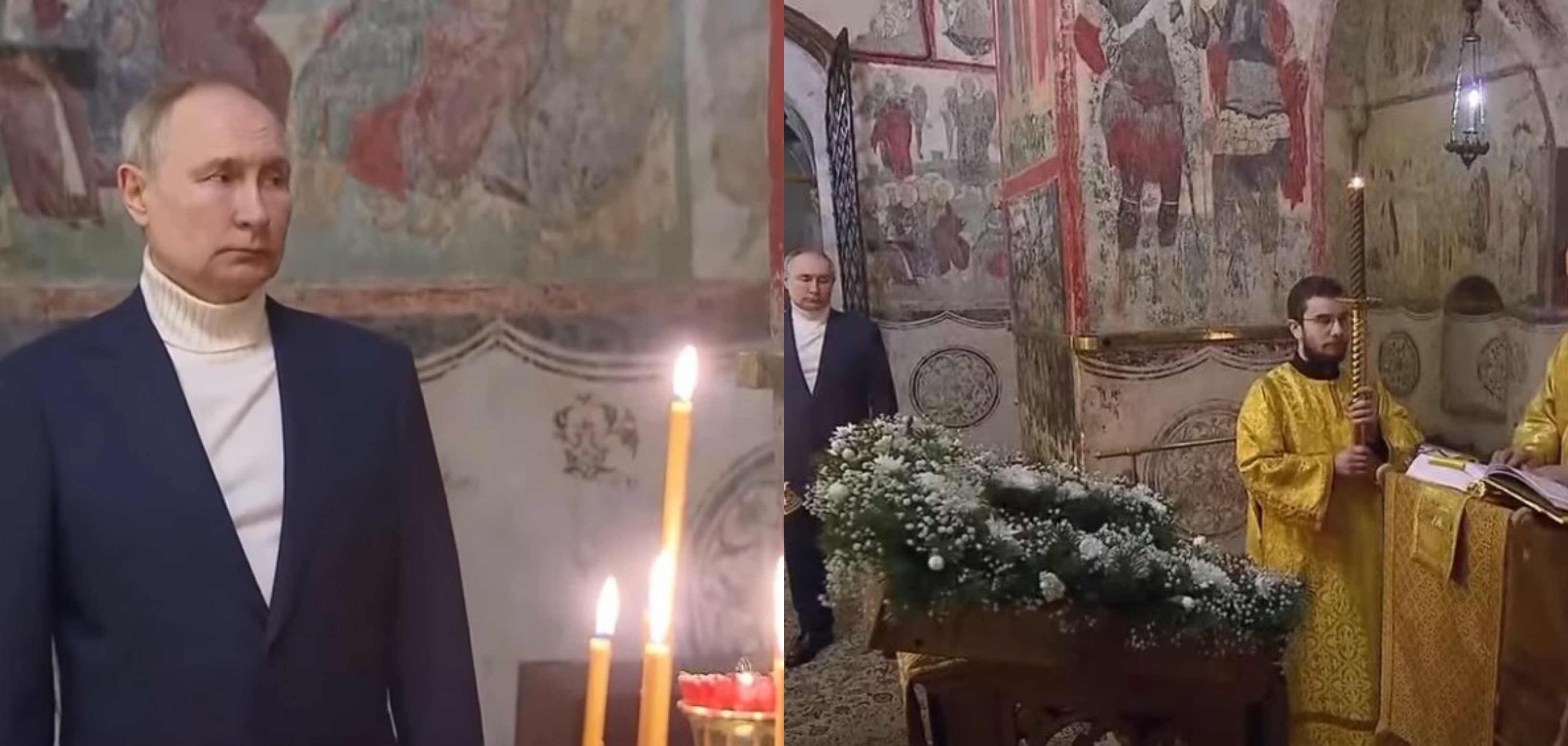 Televiziunea de stat a transmis două videoclipuri în direct cu Putin în interiorul Catedralei Buna Vestire, în timp ce preoţii ortodocşi ţineau slujba de la miezul nopţii, cunoscută sub numele de Sfânta Liturghie.