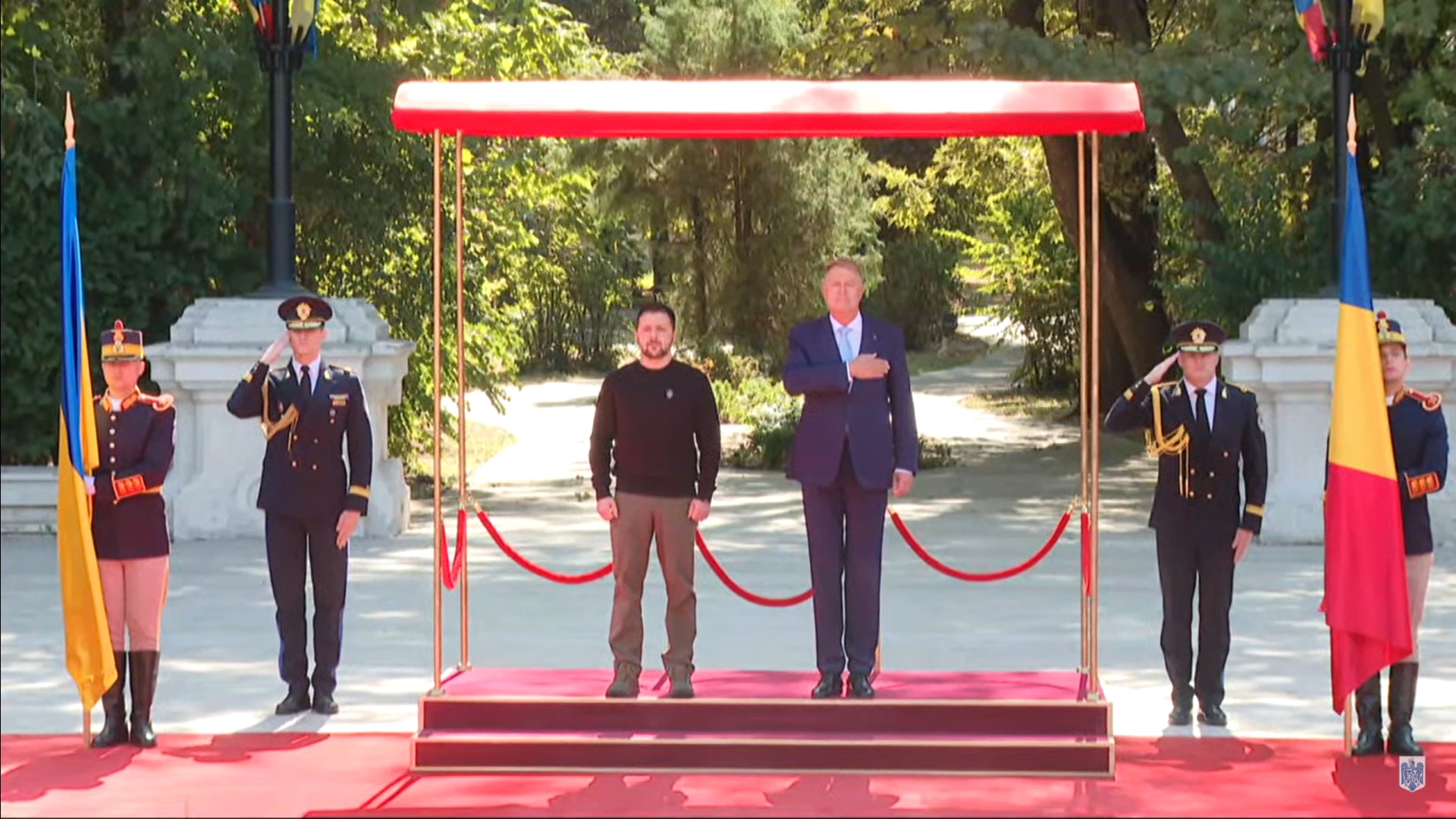 UPDATE 13.00: Președintele Volodimir Zelenski a ajuns la Cotroceni unde a fost primit de președintele Klaus Iohannis. În timpul ceremoniei de primiere au fost intonat imnurile celor două state şi urmează ca cei doi preşedinţi să aibă discuţii tete-a-tete.