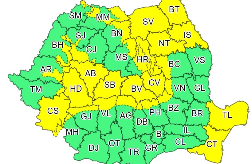 km/h, iar local și temporar și în celelalte regiuni, cu viteze în general de 40...60 km/h. Pe crestele montane și, trecător, în nordul Moldovei zăpada va fi spulberată.COD GALBEN