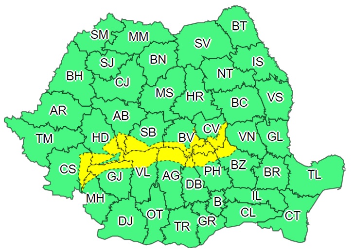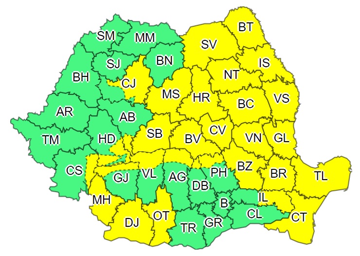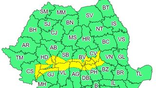 Administraţia Naţională de Meteorologie (ANM) a emis, marţi, două atenţionări Cod galben de intensificări susţinute ale vântului, prima valabilă pe parcursul întregii zile în peste trei sferturi din ţară, iar cea de-a doua cu valabilitate până miercuri dimineaţa în zone din 12 judeţe.