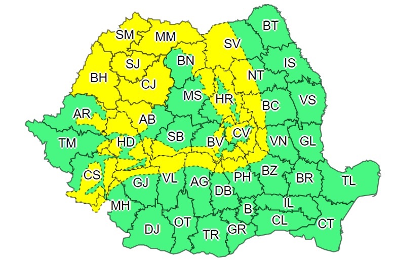 Judeţele vizate de atenţionarea Cod galben sunt: Alba, Argeş, Arad, Bacău, Bihor, Bistriţa-Năsăud, Braşov, Buzău, Cluj, Caraş-Severin, Covasna, Dâmboviţa, Gorj, Hunedoara, Harghita, Mehedinţi, Maramureş, Mureş, Neamţ, Prahova, Sibiu, Sălaj, Satu Mare, Suceava, Timiş, Vâlcea şi Vrancea.