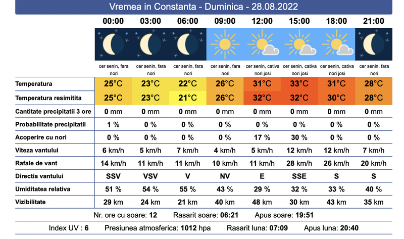 În Capitală, valori termice maxime vor fi cuprinse între 32 și 33 de grade Celsius. Vor exista și condiţii de apariţie a averselor, cu temperaturi de cel mult 31 de grade Celsius.