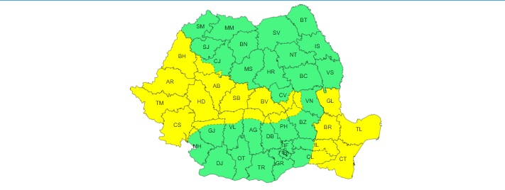 Potrivit ANM, sunt vizate de codul galben de vânt puternic județele: Bihor, Arad, Timiș, Caraș-Severin, Cluj, Alba, Hunedoara, Sibiu, Brașov, Covasna, Vrancea, Buzău, Prahova, Dâmbovița, Argeș, Vâlcea, Gorj, Mehedinți, Galați, Brăila, Ialomița, Călărași, Tulcea și Constanța.