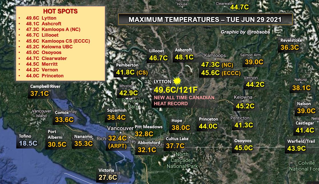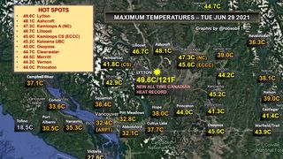 Localitatea Lytton din Columbia Britanică a înregistrat recorduri de temperatură, marți după-amiază, când aerul s-a încălzit până la 49,6 C (121,1F).
