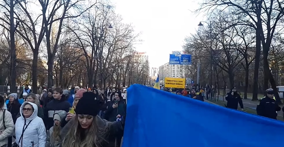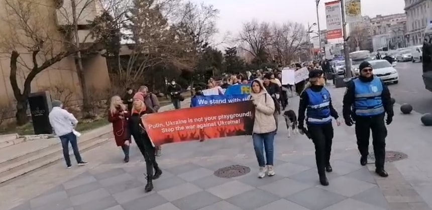 După un timp, participanţii au plecat în marş spre Ambasada Rusiei, însoţiţi de jandarmi. Ei au scandat "Putin, criminal", "Stop război", "NATO, close the sky (NATO, închide cerul)".