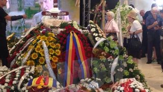 În foaierul TNB au fost aduse, înca de la ora 10.00, coroane de flori, care înconjoara sicriul, si au fost aprinse candele.