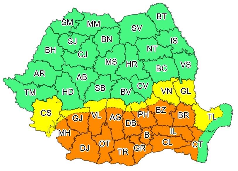 Administrația Națională de Meteorologie a extins începând de duminică, 24 iulie, codul portocaliu de caniculă pentru județele din sudul țării.