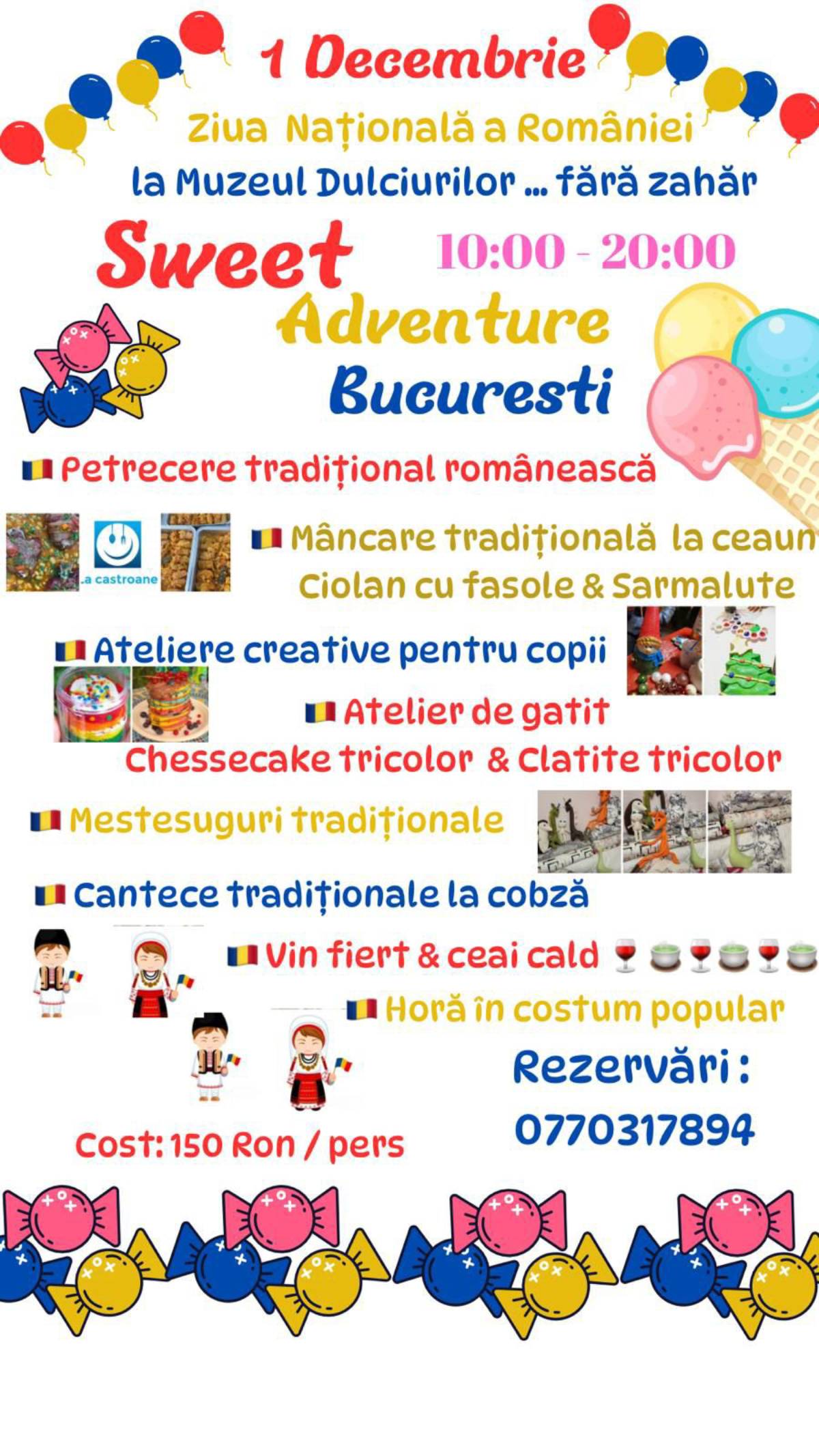 Duminică, 1 Decembrie, la Sweet Adventure, Muzeul Dulciurilor fără zahăr, facem împreună cheesecake și clătite tricolore. Vizitatorii vor putea degusta și din fasolea cu ciolan la tuci ori sarmalele delicioase.