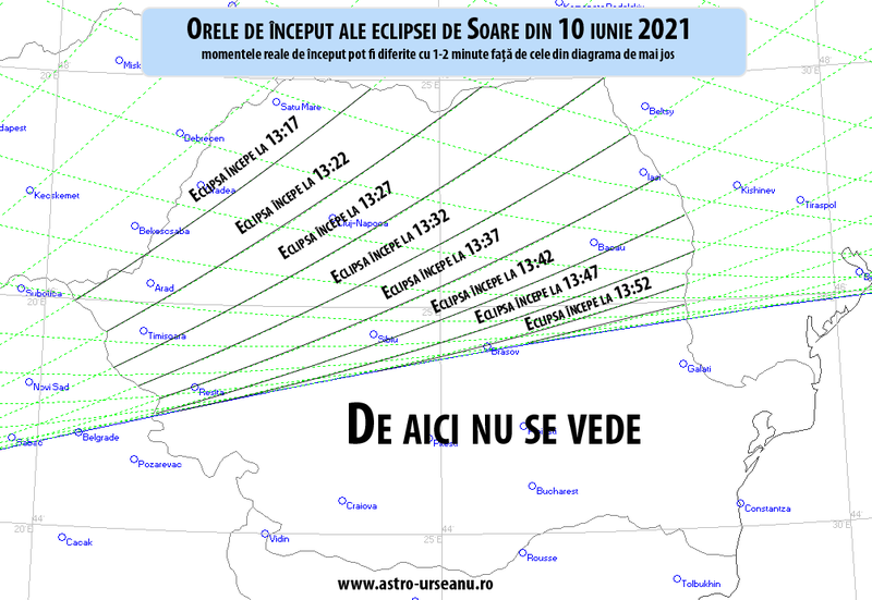 Observatorul Astronomic „Amiral Vasile Urseanu” a transmis că eclipsa de Siare din 10 iunie se va vedea ca parțială din jumătatea de nord a țării noastre. Eclipsa începe cel mai devreme la ora 13:17, în nord-vest, și va avea ca acoperire maximă 2,1% din discul Soarelui.